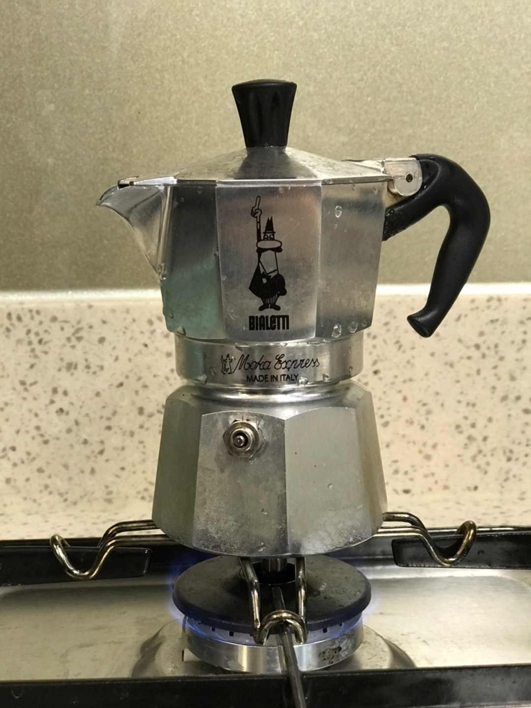 4. 가스레인지에 사발이를 올리고, 사발이 위에 비알레띠 모카포트를 올립니다! 불은 꼭 약불로 해주세요! 가스불이 모카포트 바닥을 넘지 않도록 해주시면 됩니다! 2-3분 정도면 보글보글 소리가 납니다!